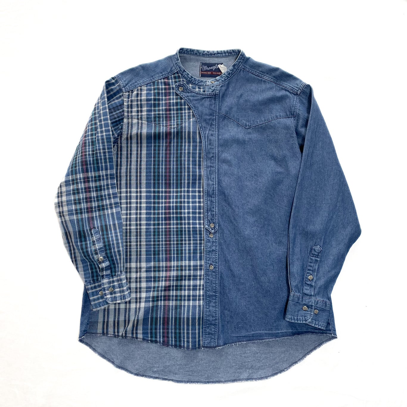 90s Wrangler ラングラー アシンメトリー ノーカラー デニム シャツ 17 1/2 35 ビンテージ 27MW 50s 60s