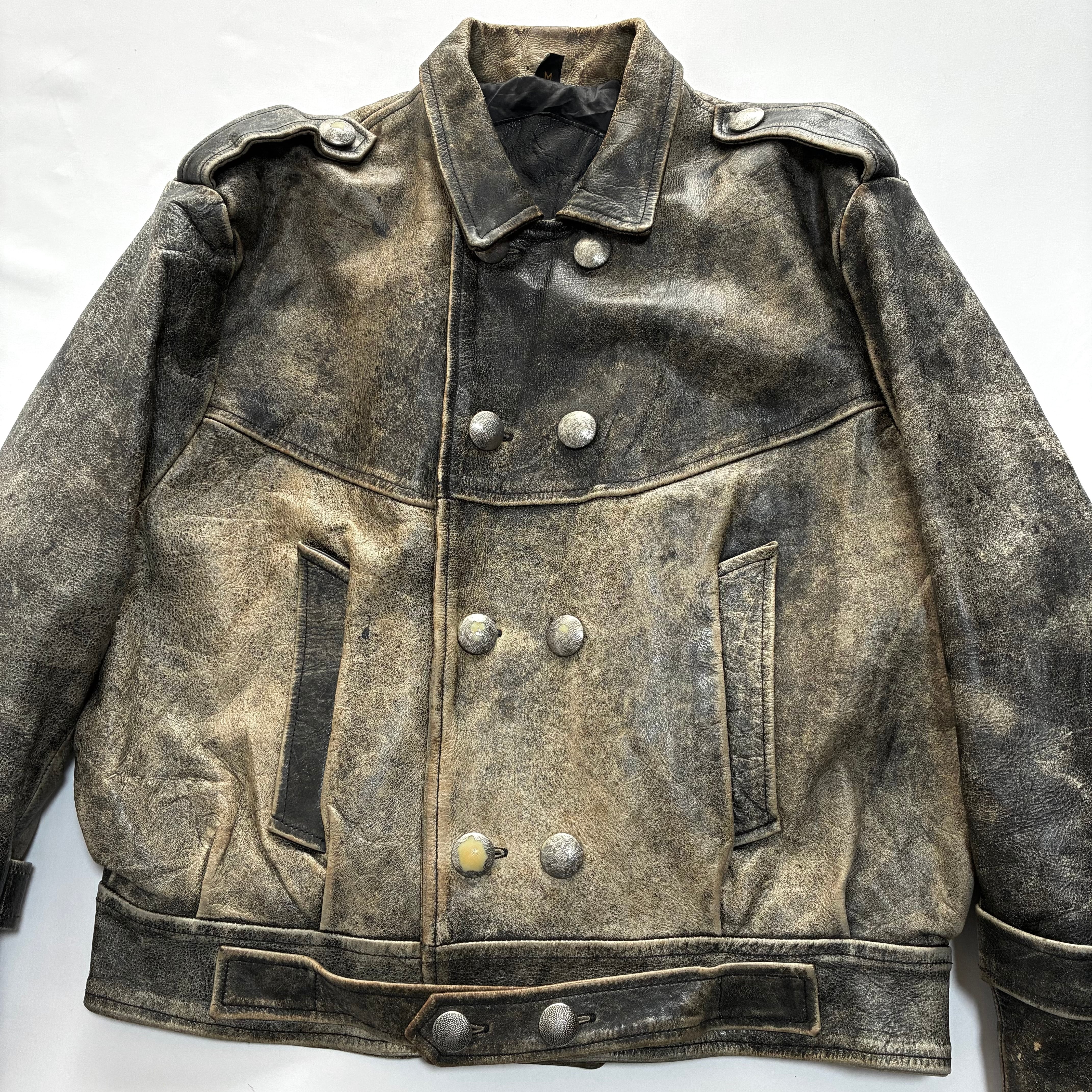 【Condition】 レザー特有のスレ、キズ、襟元、背面に汚れ、ボタンに塗装剥がれございます。その他ダメージはなくこれからも末永くご愛用いただけます。