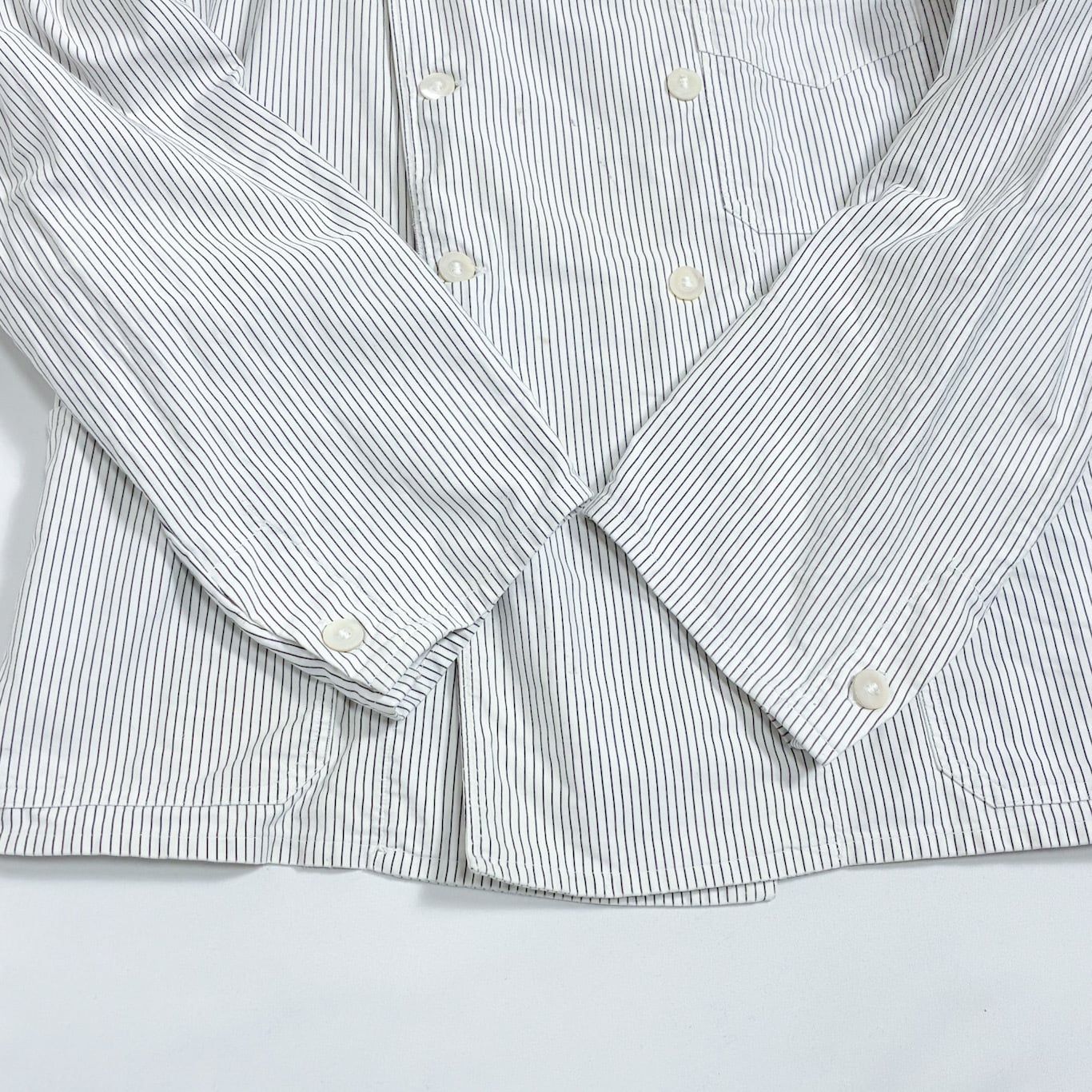 フランス特有の丸い襟、フロントはダブルブレスト、ボディーはストライプ柄、胸ポケットは人気のVポケになります。