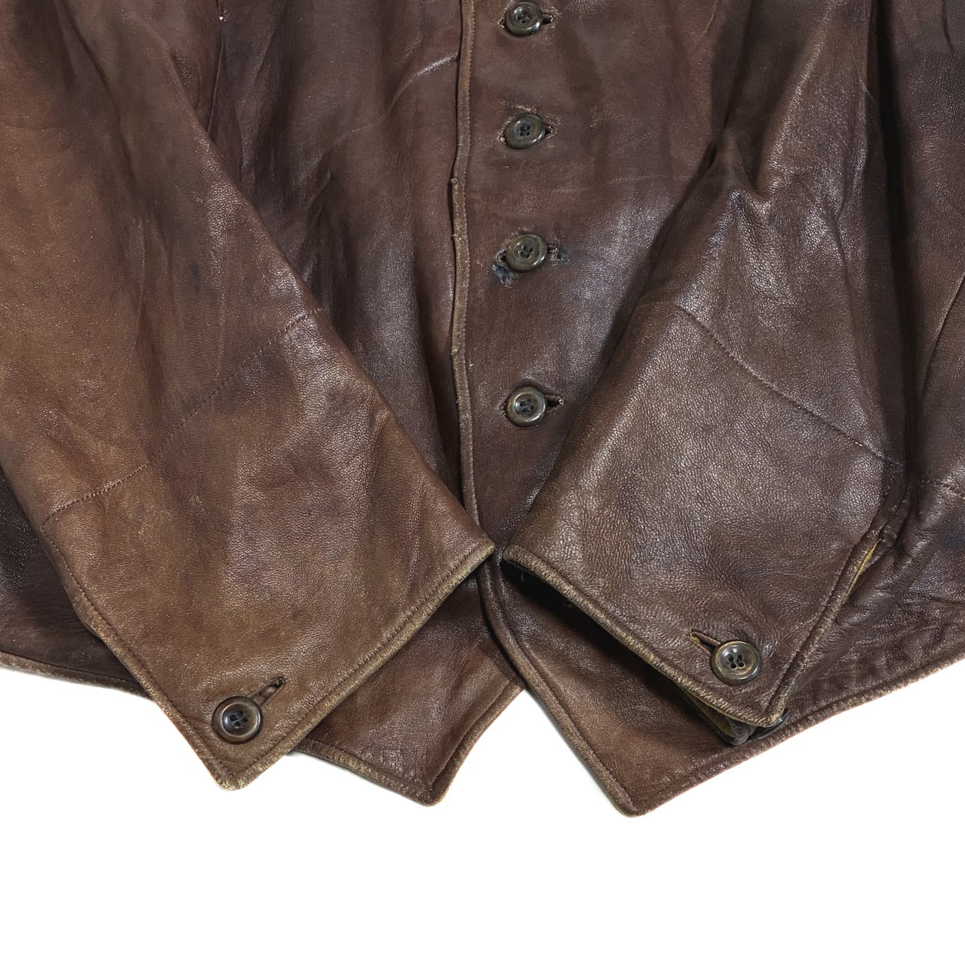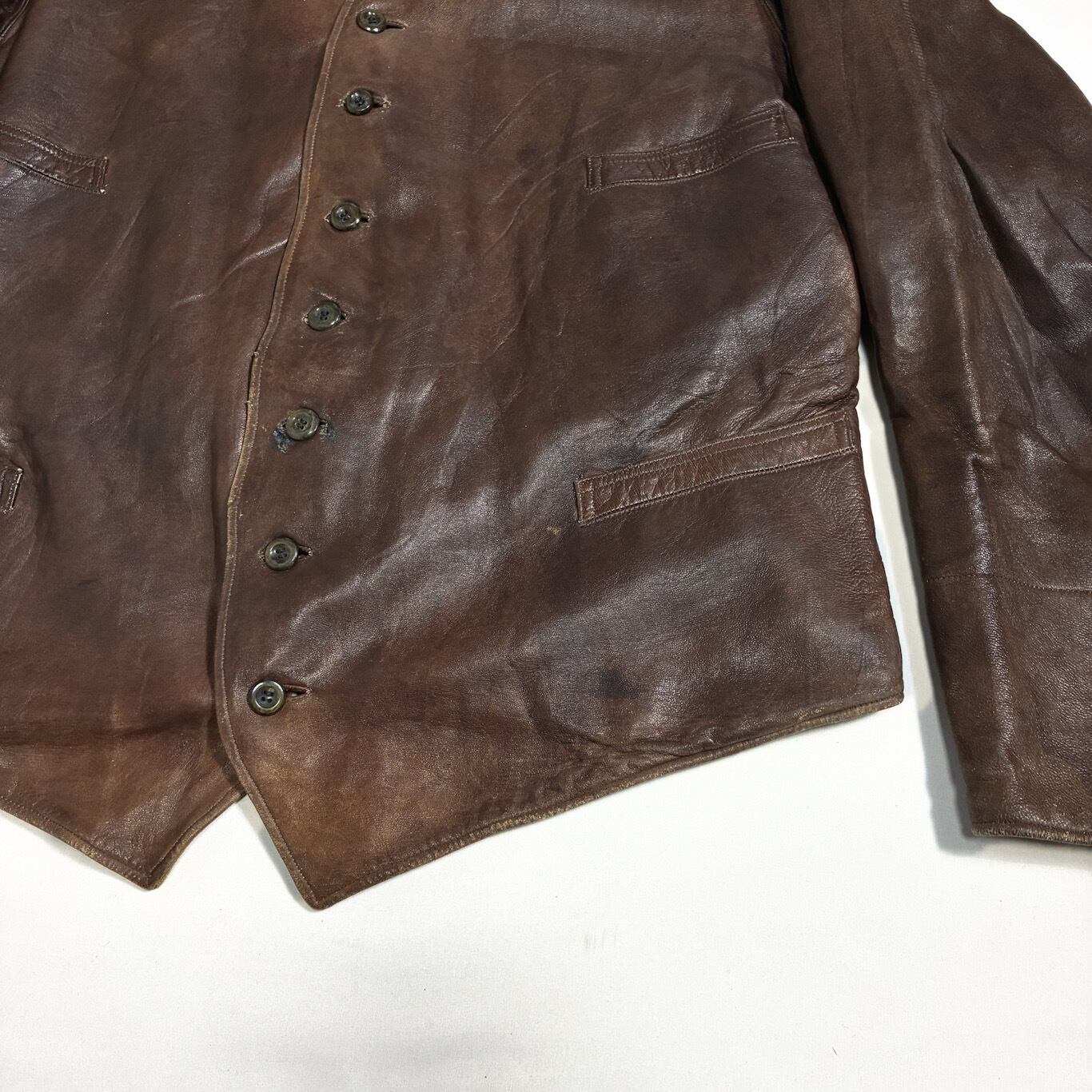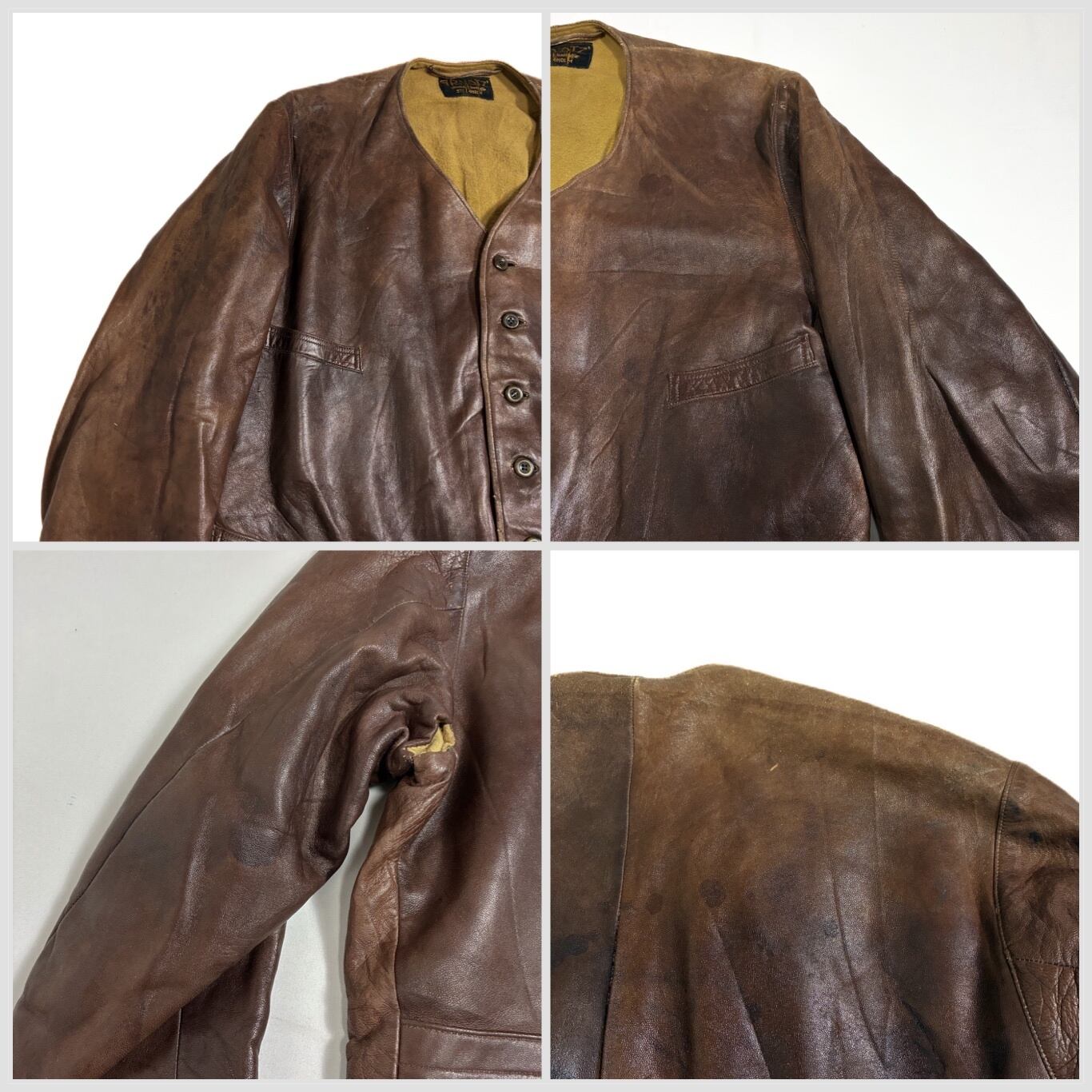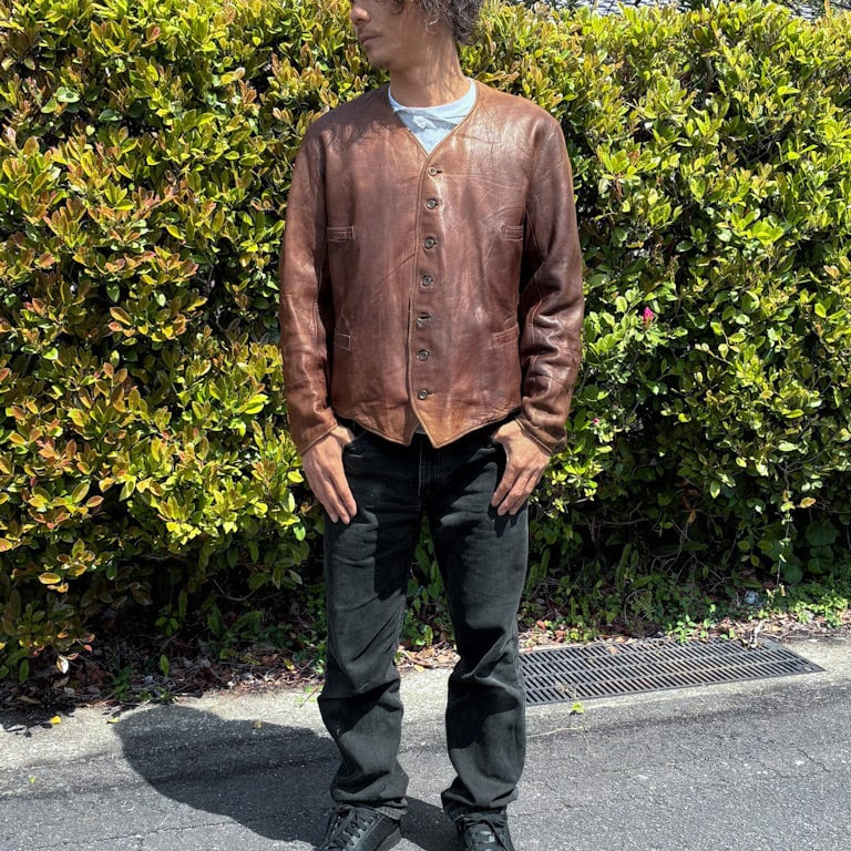 【Condition】 レザー特有のスレキズ、小キズ、汚れ、フロントボタンホール下から3つ目部分に補修がございます。大きなダメージは見受けられず旧いものですがまだまだご愛用いただけます。
