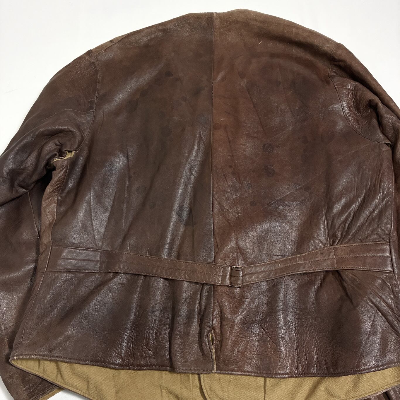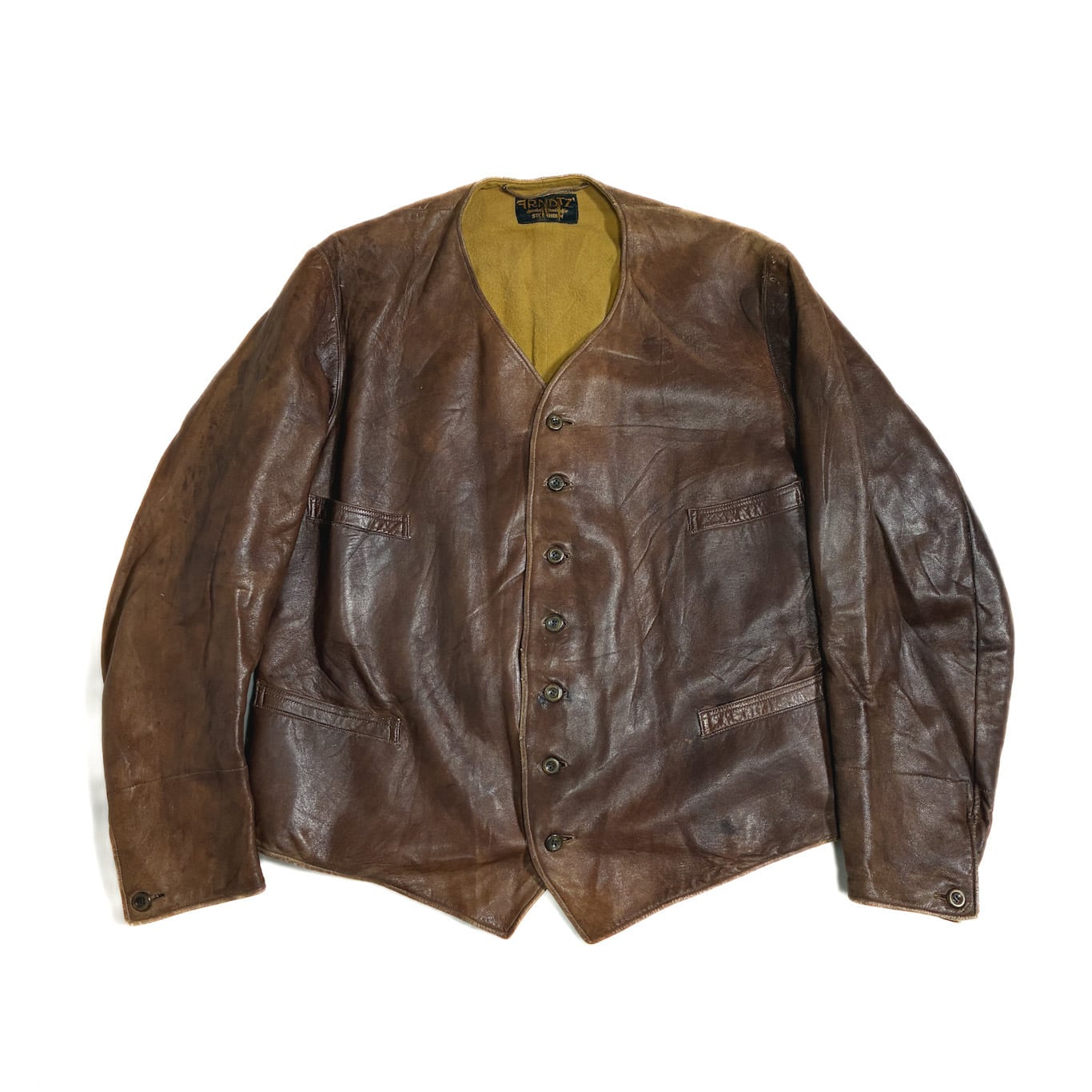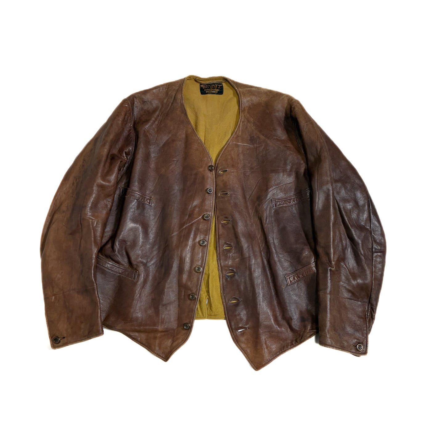 【Condition】 レザー特有のスレキズ、小キズ、汚れ、フロントボタンホール下から3つ目部分に補修がございます。大きなダメージは見受けられず旧いものですがまだまだご愛用いただけます。