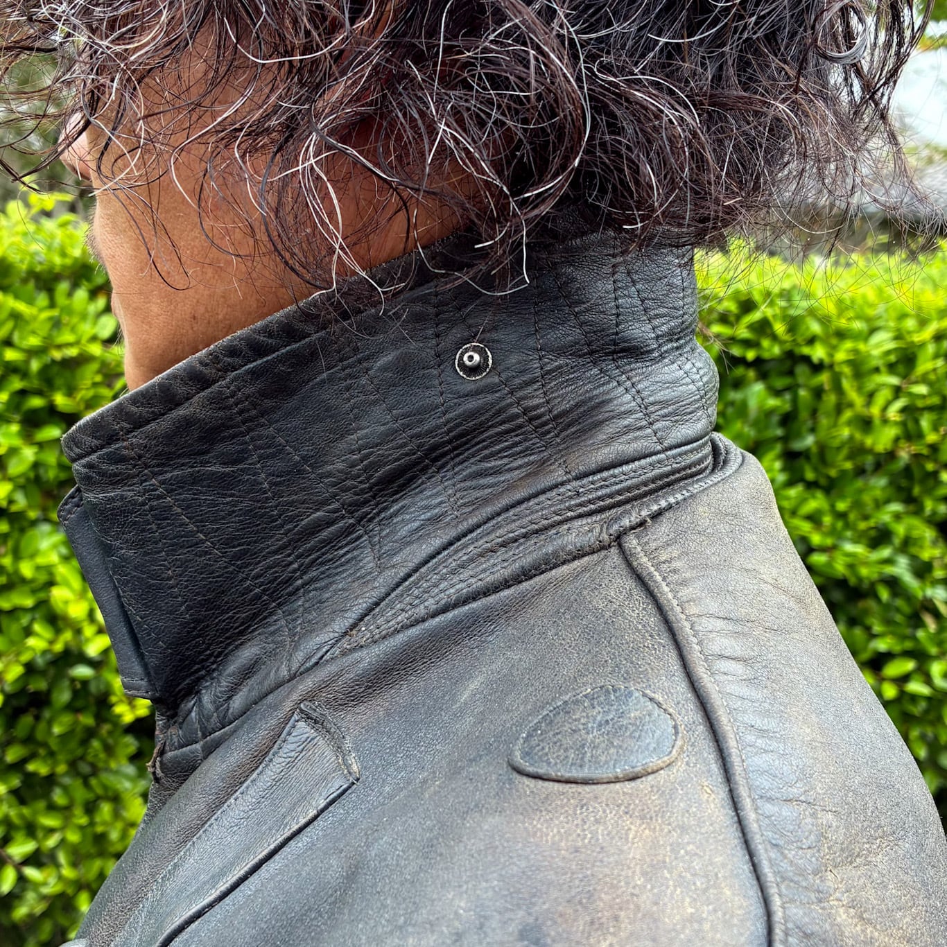 重厚なレザーに、フロントは印象的なクルミボタンのダブルブレスト仕様。