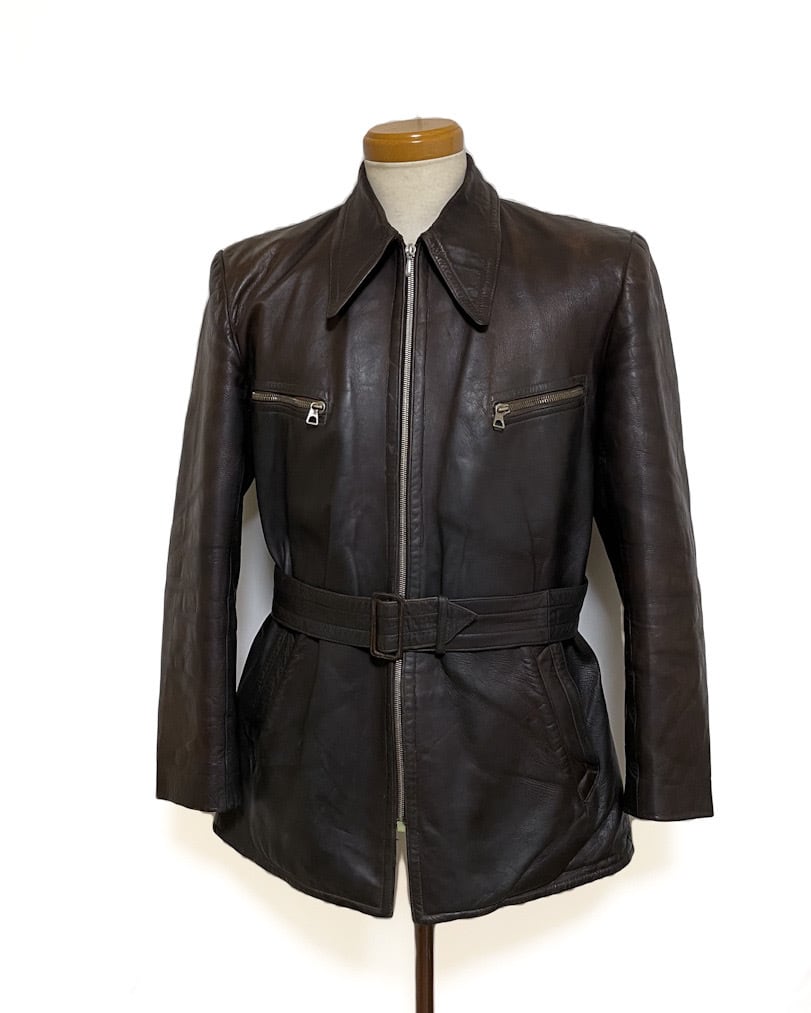 40s 50s ユーロ ヴィンテージ レザー カーコート ベルト付き ダークブラウン ライダースジャケット ヨーロッパ古着