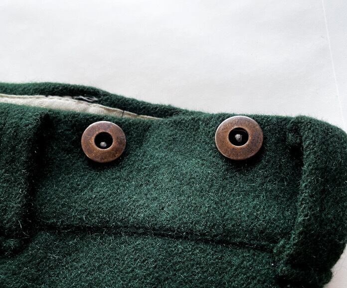 落ち着いたダークグリーンのカラー、上質なウールにサスペンダー用のドーナツボタンが付きます。