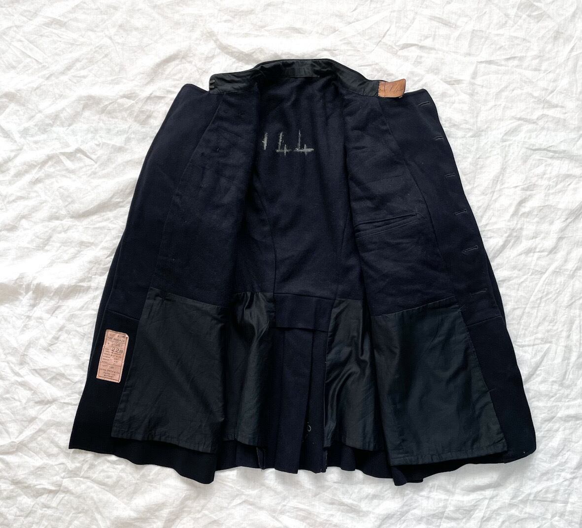 ボディーはブラックに近いダークネイビーのやわらかなウール、裾は切りっぱなしになっています。