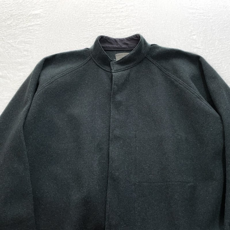 ボディーは目の詰まった圧縮ウールを採用、フロントはスナップボタンにて開閉するタイプ、背面はプリント入りになり存在感のある1着です。
