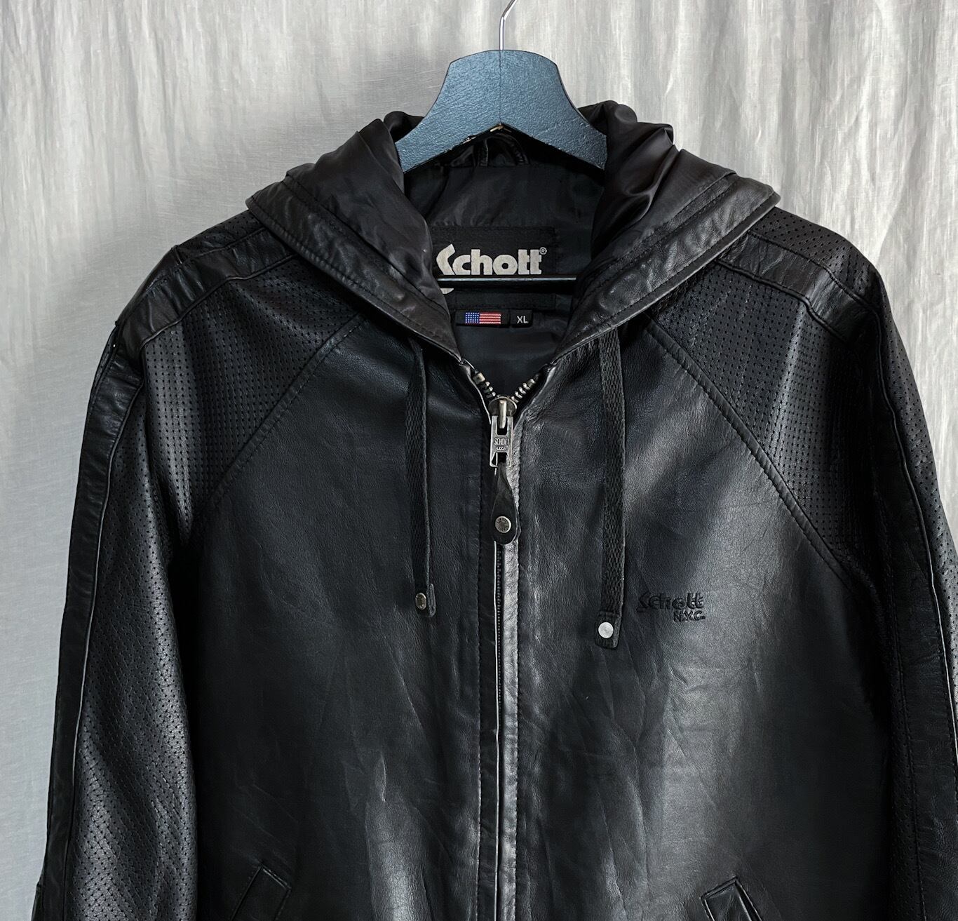 希少 Schott ショット パンチング メッシュ切替 レザー パーカー XL ブラック ライダース