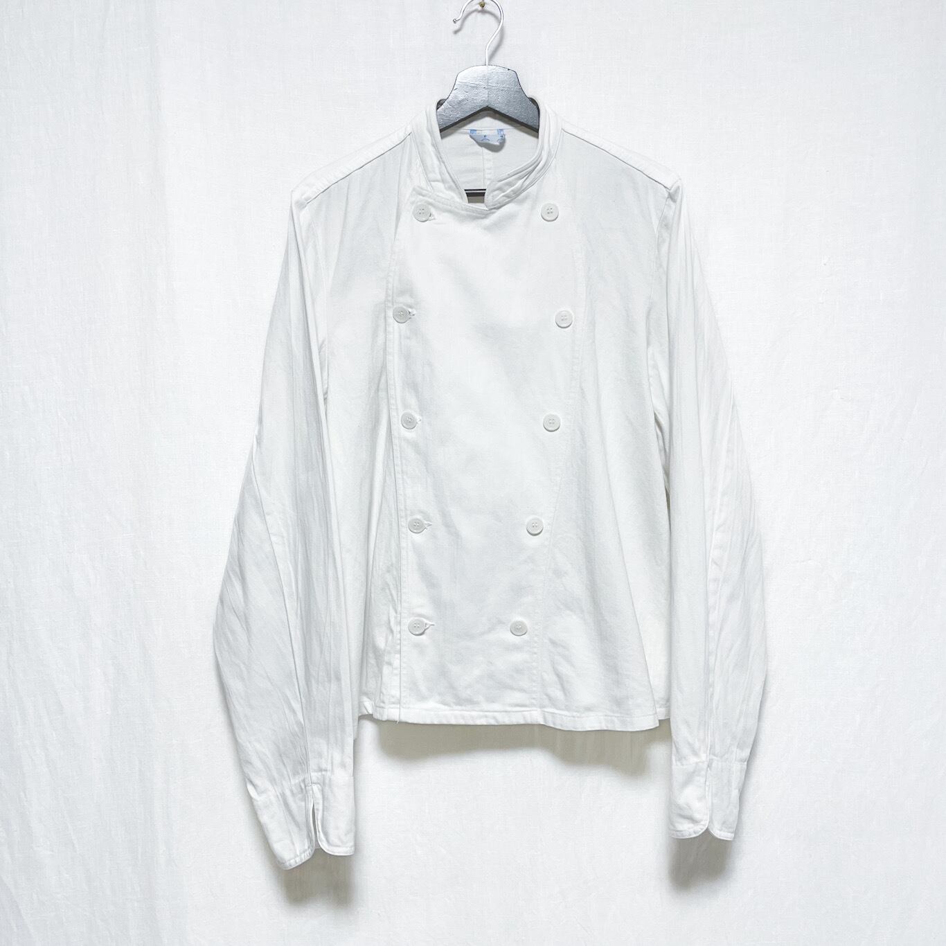スタンダードカラー、フロントは印象的なダブルブレスト、ボディーは鮮やかなホワイトカラーのコットン、程よい生地厚になり長いシーズン着用いただけます。