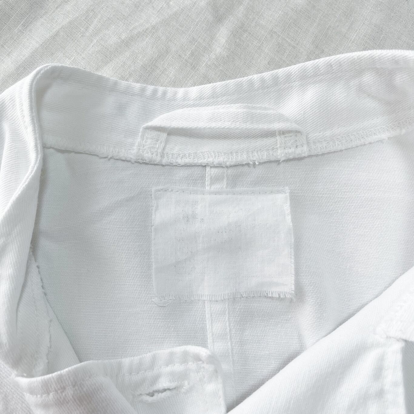 スタンダードカラー、フロントは印象的なダブルブレスト、ボディーは鮮やかなホワイトカラーのコットン、程よい生地厚になり長いシーズン着用いただけます。