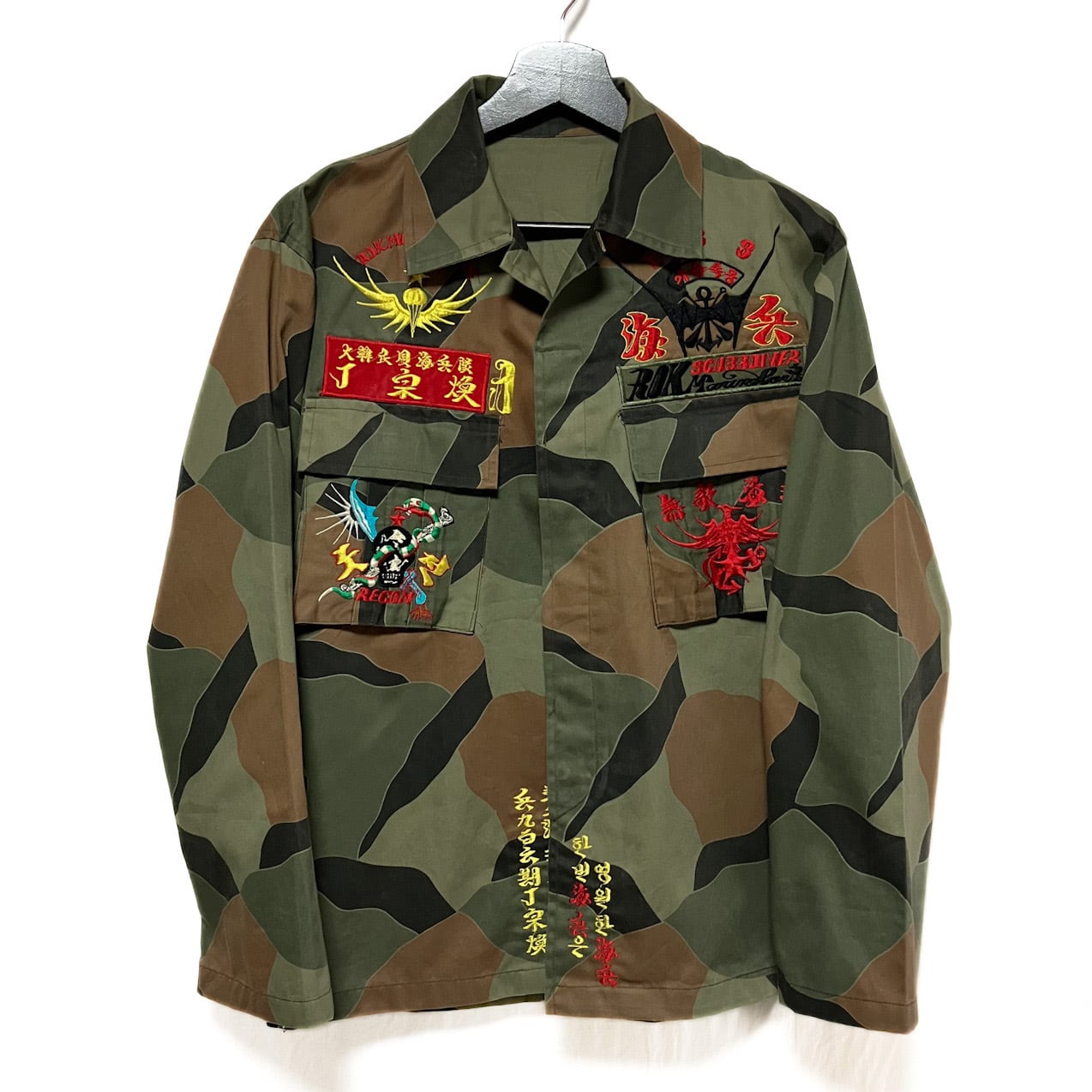 落ち着いた迷彩に派手な刺繍の組み合わせがバランスよく、尖った雰囲気を醸し出す存在感抜群の迷彩ジャケットです!