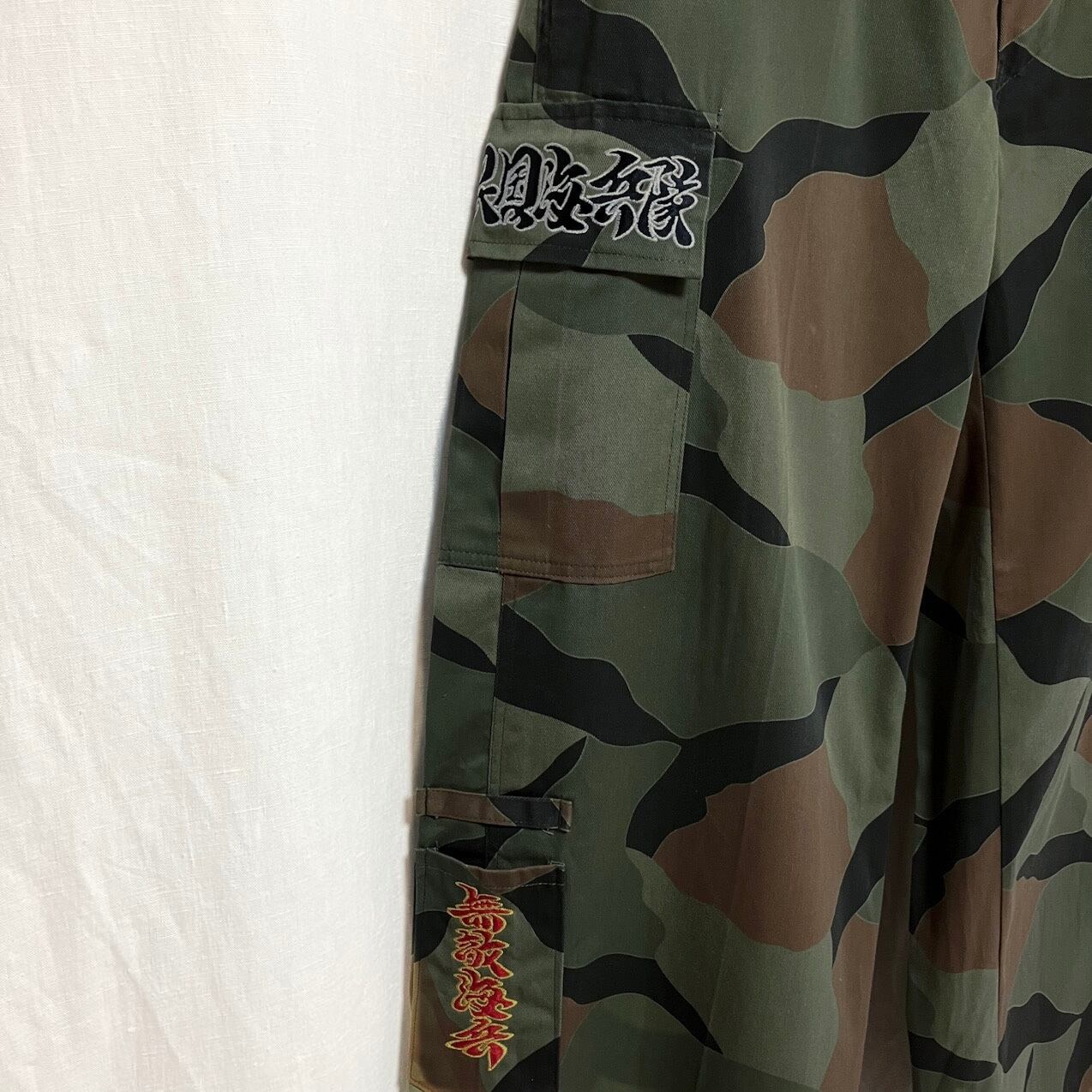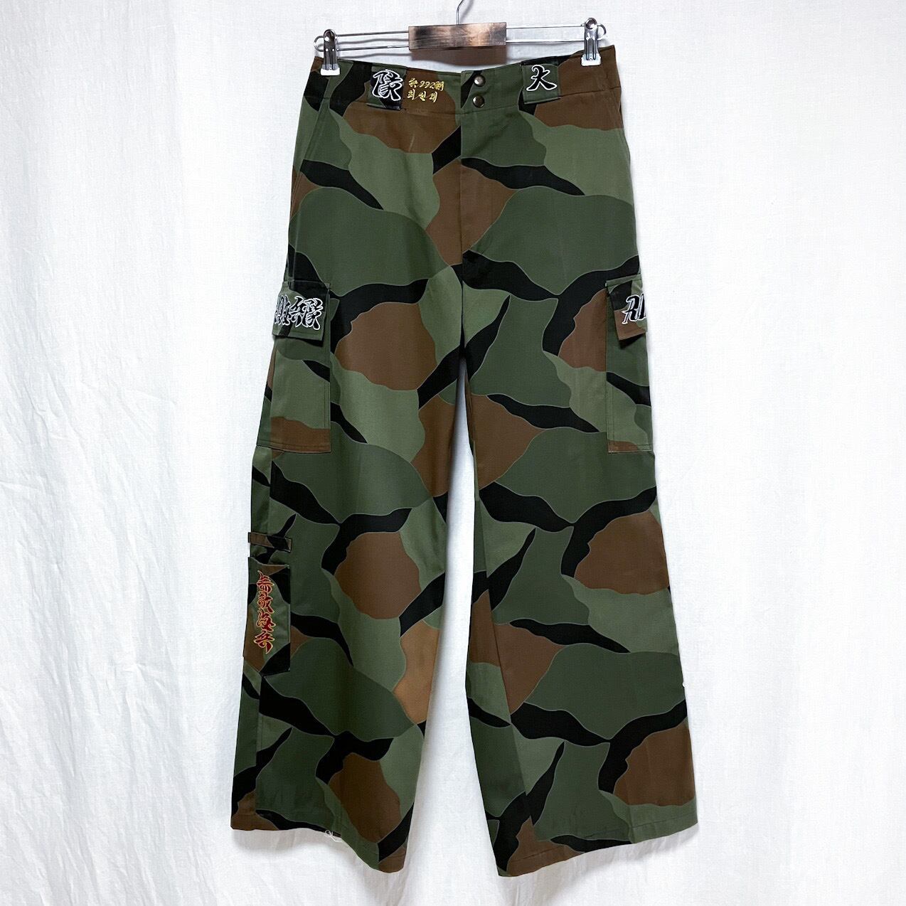 落ち着いた迷彩に派手な刺繍の組み合わせがバランスよく、尖った雰囲気を醸し出す存在感抜群の迷彩パンツです!