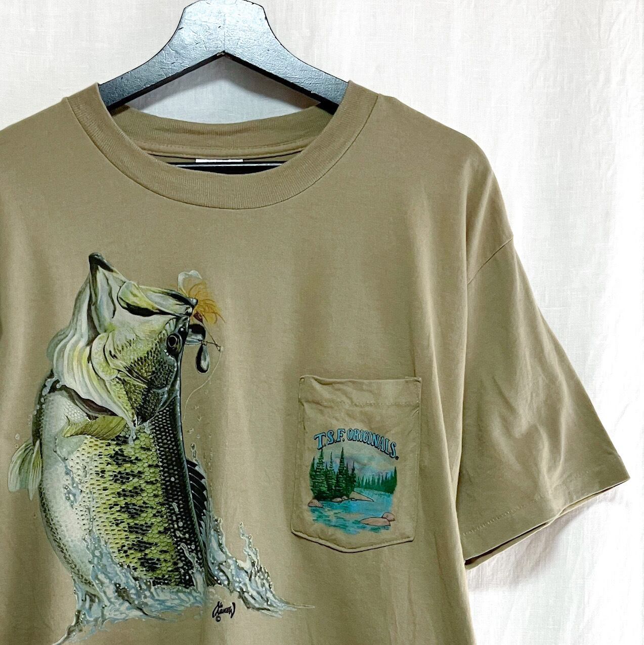 良品 90s USA製 TSF 半袖 ポケット Tシャツ ブラックバス 両面プリント L フィッシング TSF ORIGINALS カーキ