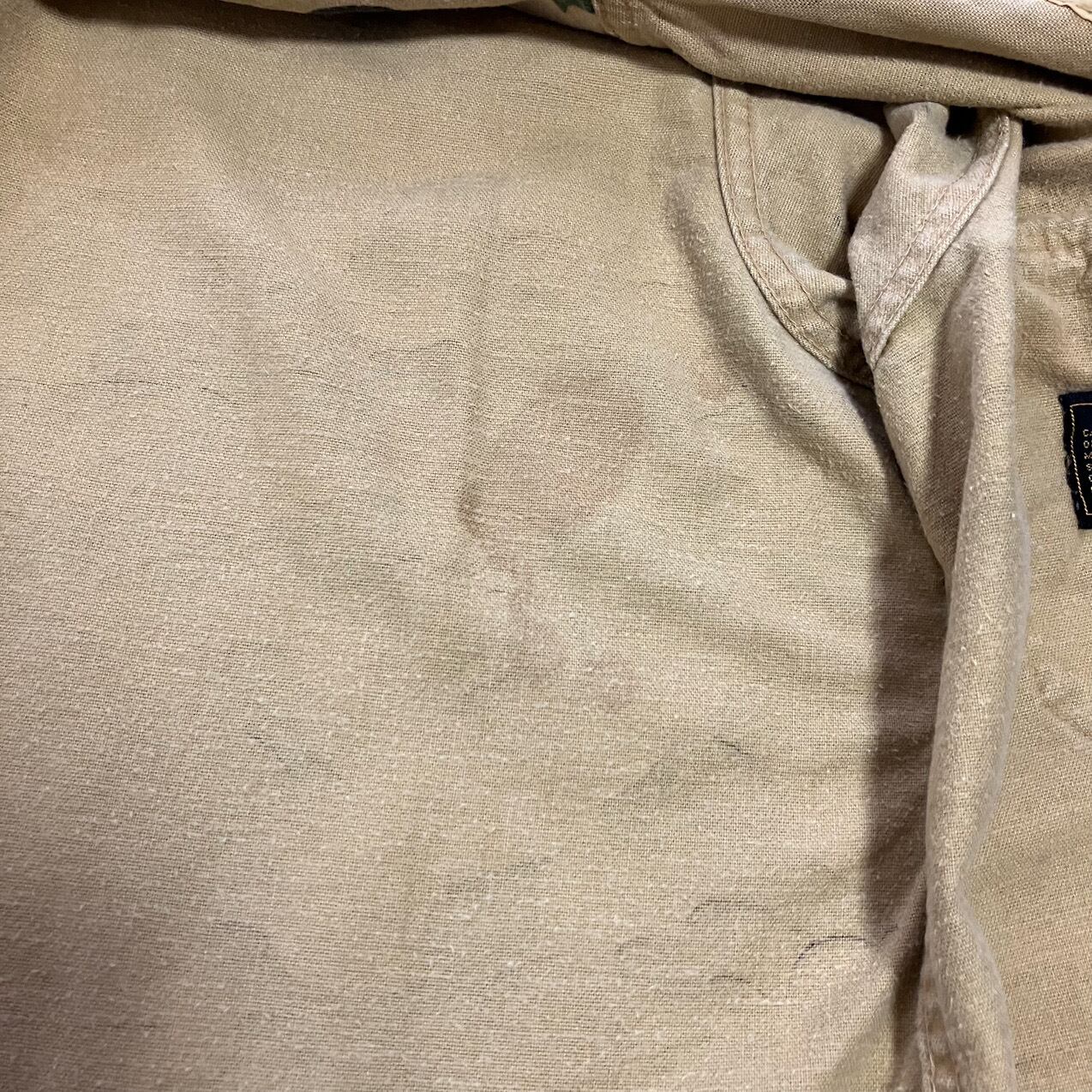 【Condition】フロント腹部付近と右胸付近、裏地、背中部分に薄汚れ、バック襟下ほつれあり。多少の着用感フェード感ございますがダメージや汚れもなくこれからもご愛用いただけます