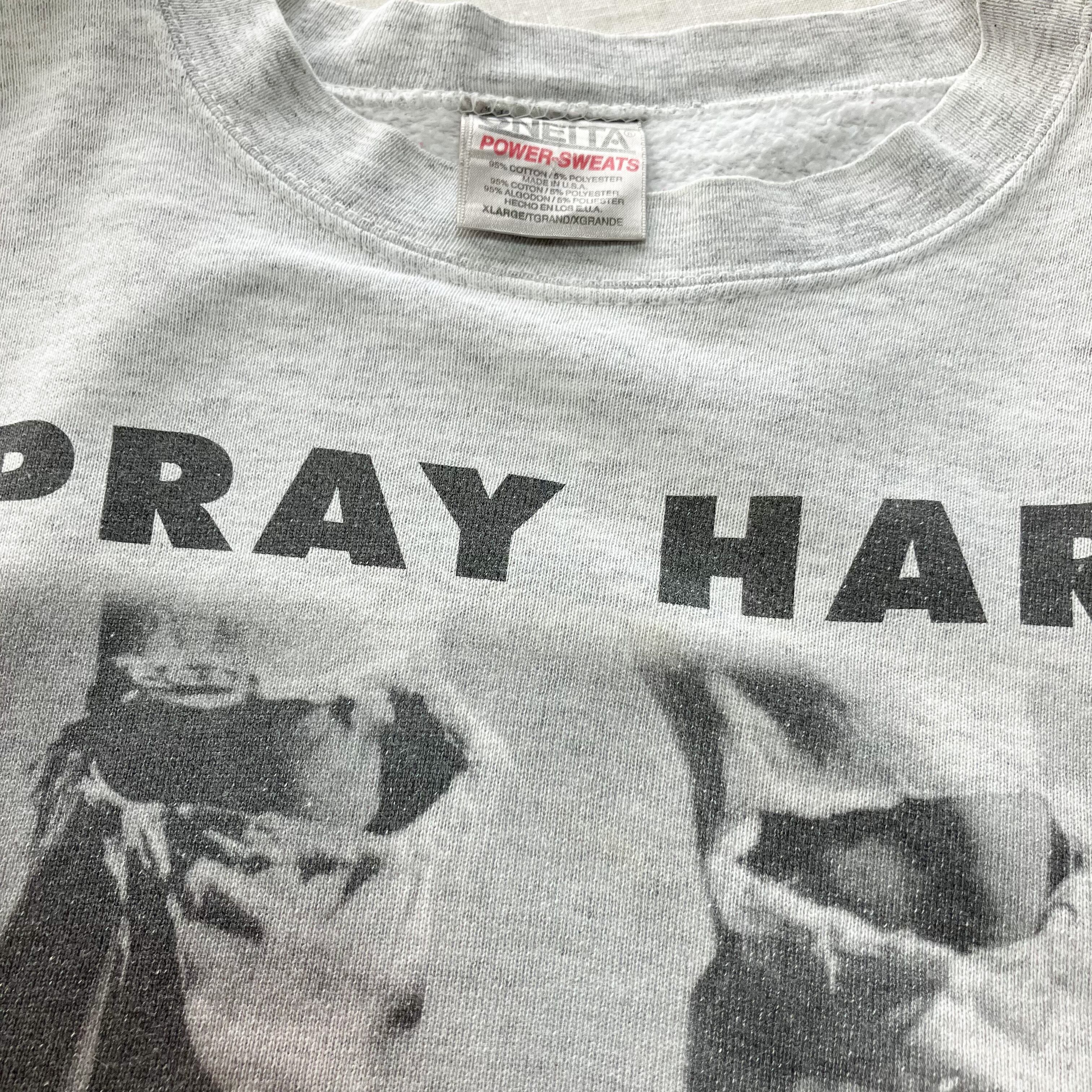 90s USA製 PRAY HARD ONEITA プリント スウェット シャツ 霜降りグレー 聖書 グッド デザイン XL