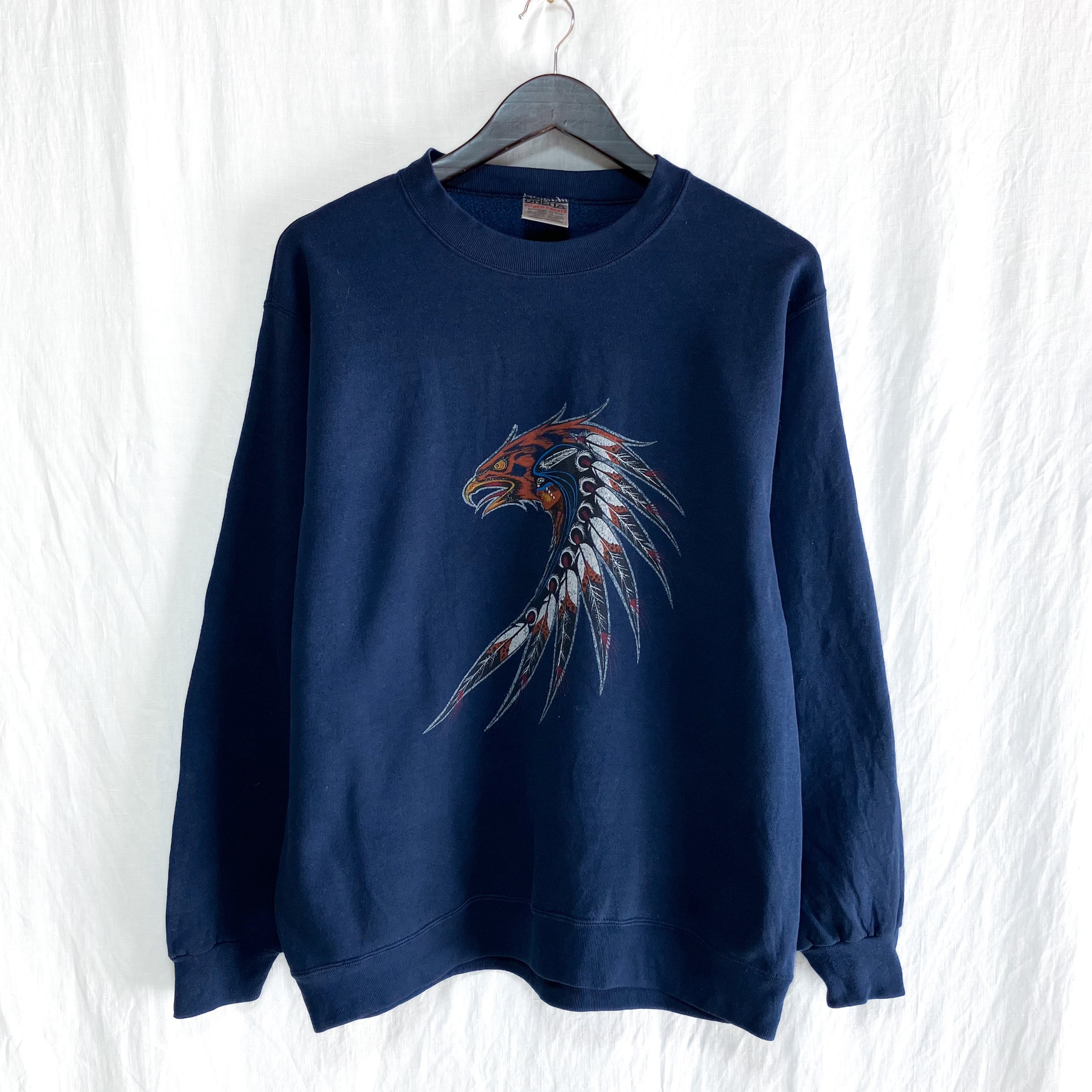 90s USA製 アニマル プリント 鷹 スウェット シャツ ネイビー グッド デザイン L
